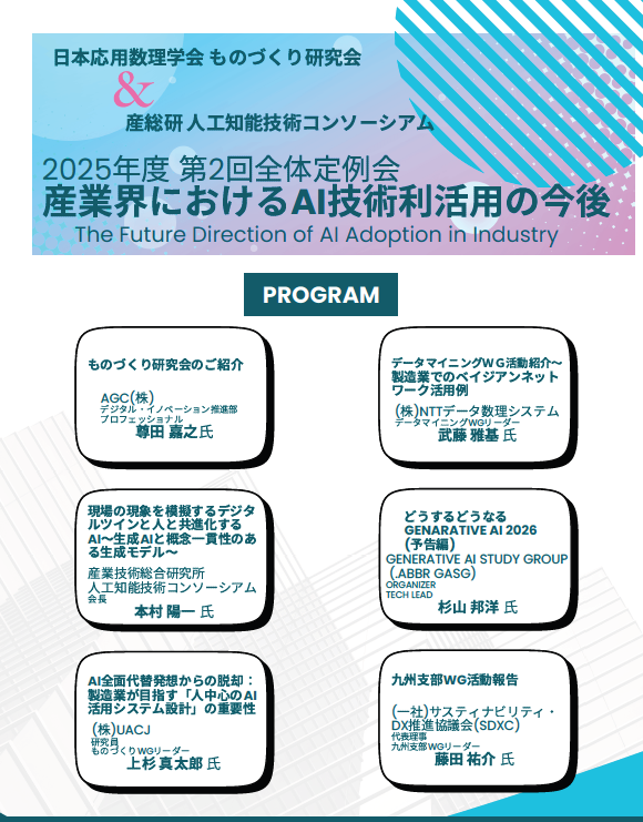 2025年12月23日(火)、産総研臨海副都心センターにて、「日本応用数理学会ものづくり研究会」様と共催で、人工知能技術コンソーシアム第2回全体定例会が開催されました。