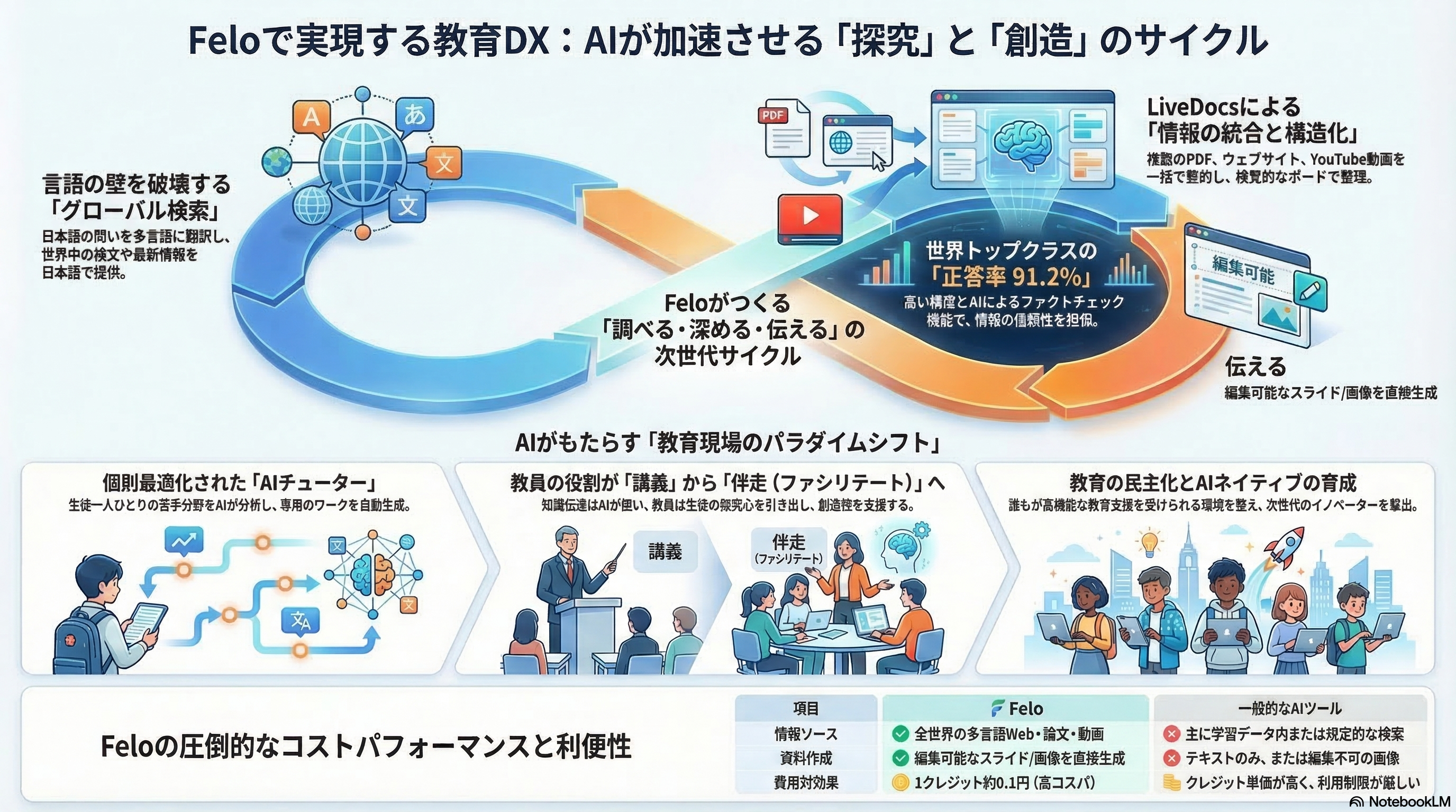 タイトルは “Feloで実現する教育DX:「調べる・深める・伝える」” です。