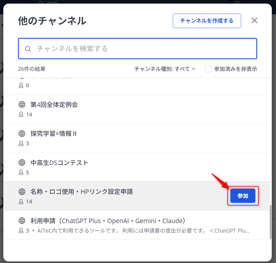 4.参加したいチャネルを選択すると「参加」ボタンが表示されるので押下します