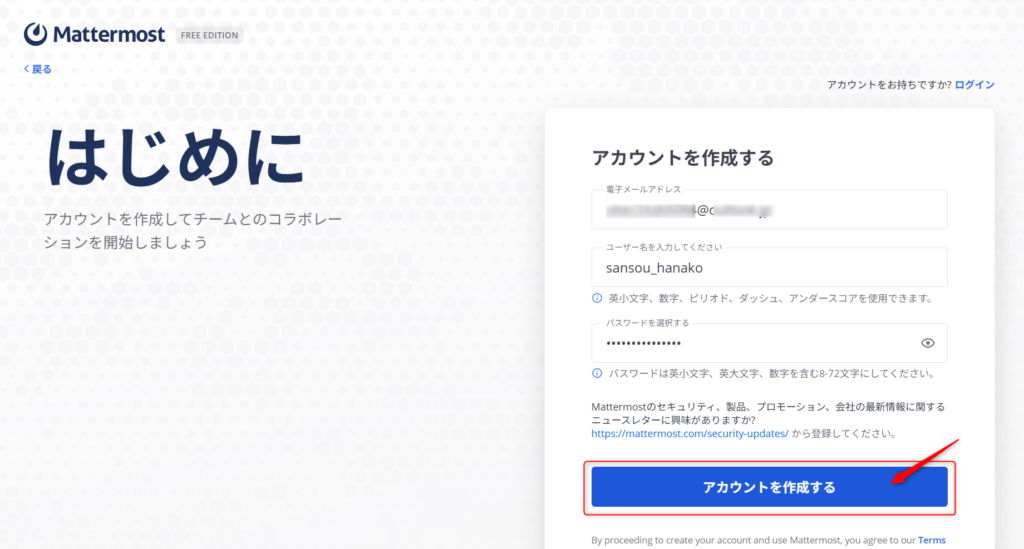 3.「電子メールアドレス」「ユーザー名」「パスコード」を設定します。