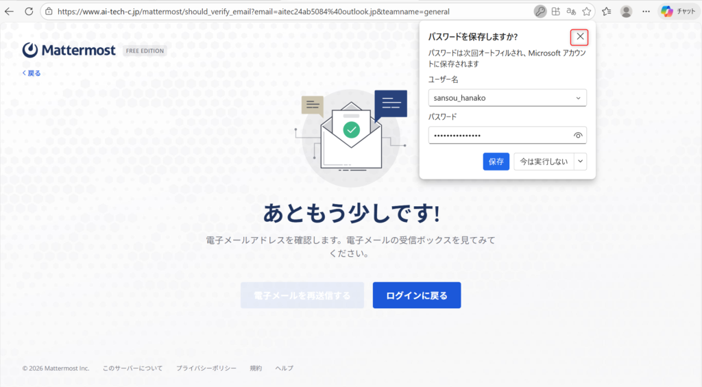5.パスワード保存画面などは「×」で閉じます。(この操作は任意です)