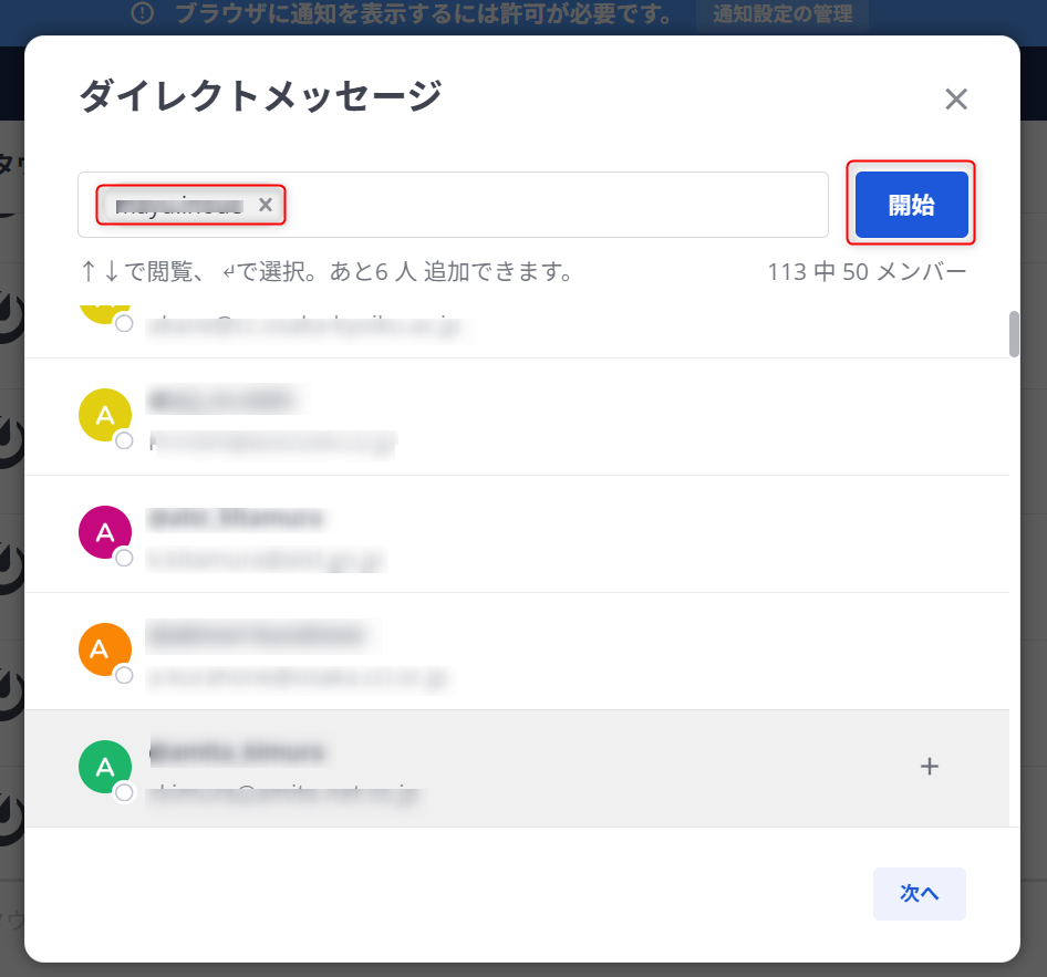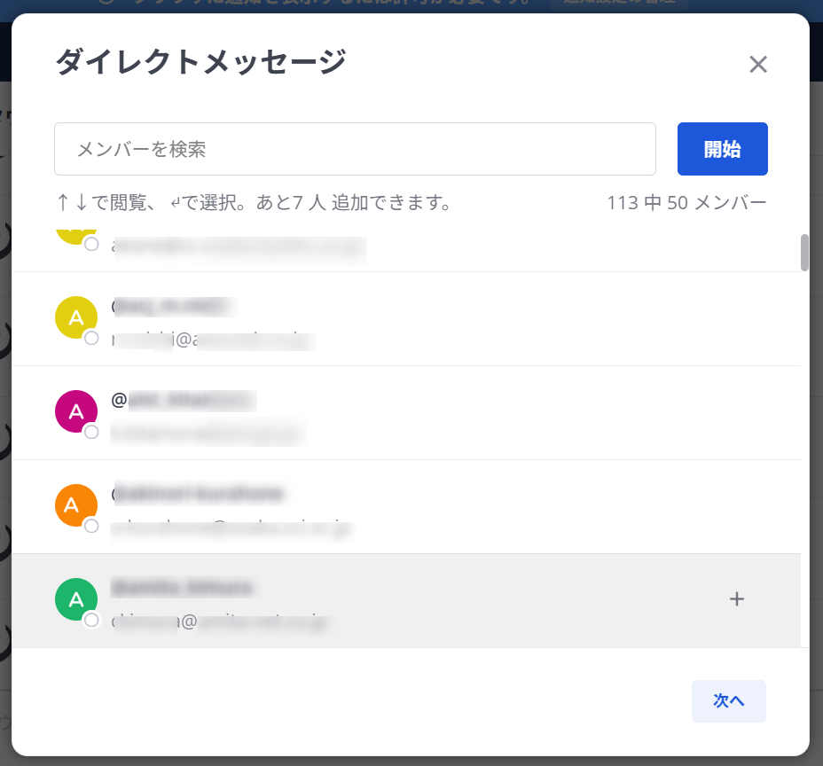 2.メンバーを検索し、メッセージを送付したい相手の右横にある「+」を押下します